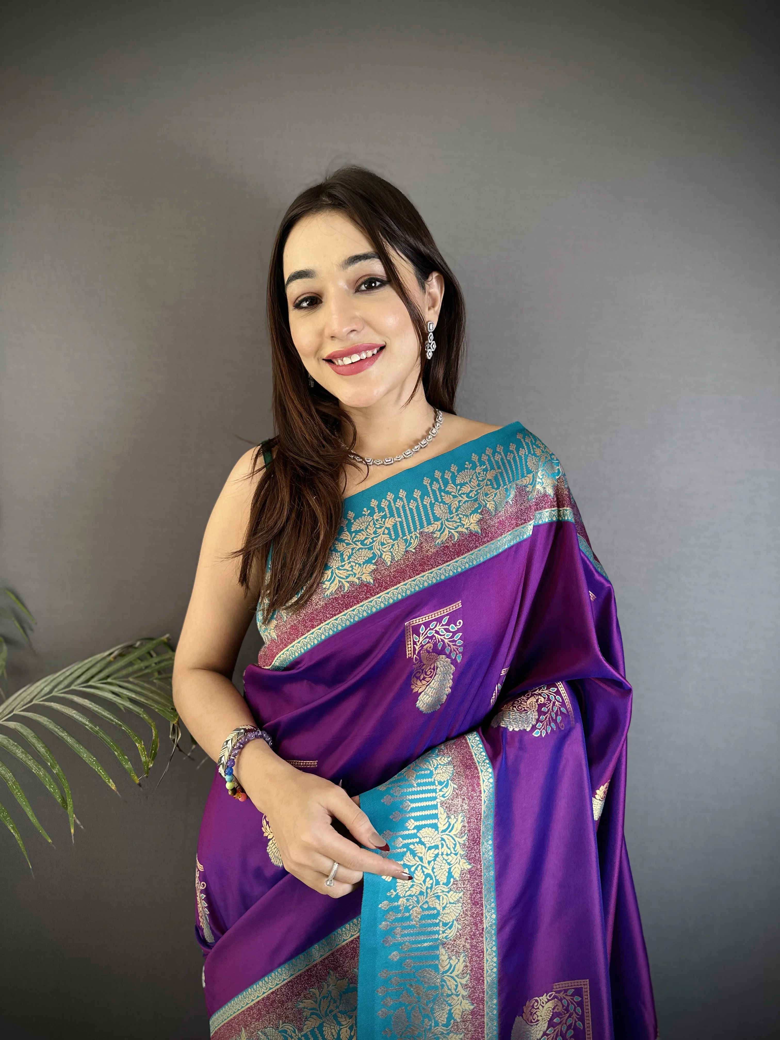 Sonakshi Women'S Blue Pure Soft Banarasi Silk With Contrast Weaving Border And Pallu Traditional Saree With Blouse