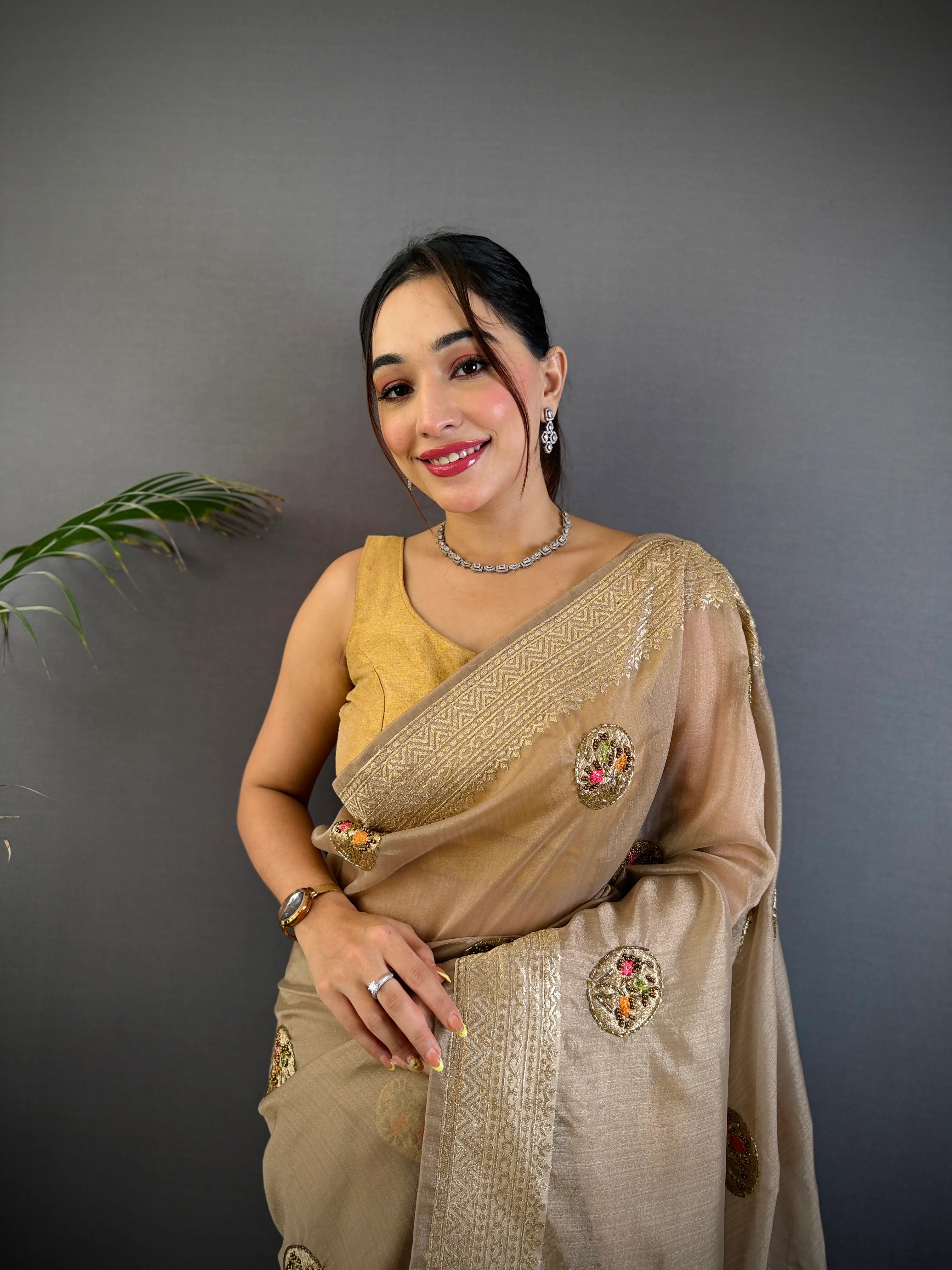 Sonakshi Women'S Chiku Pure Organza Silk With Attractive Embroidery Work Traditional Saree With Blouse