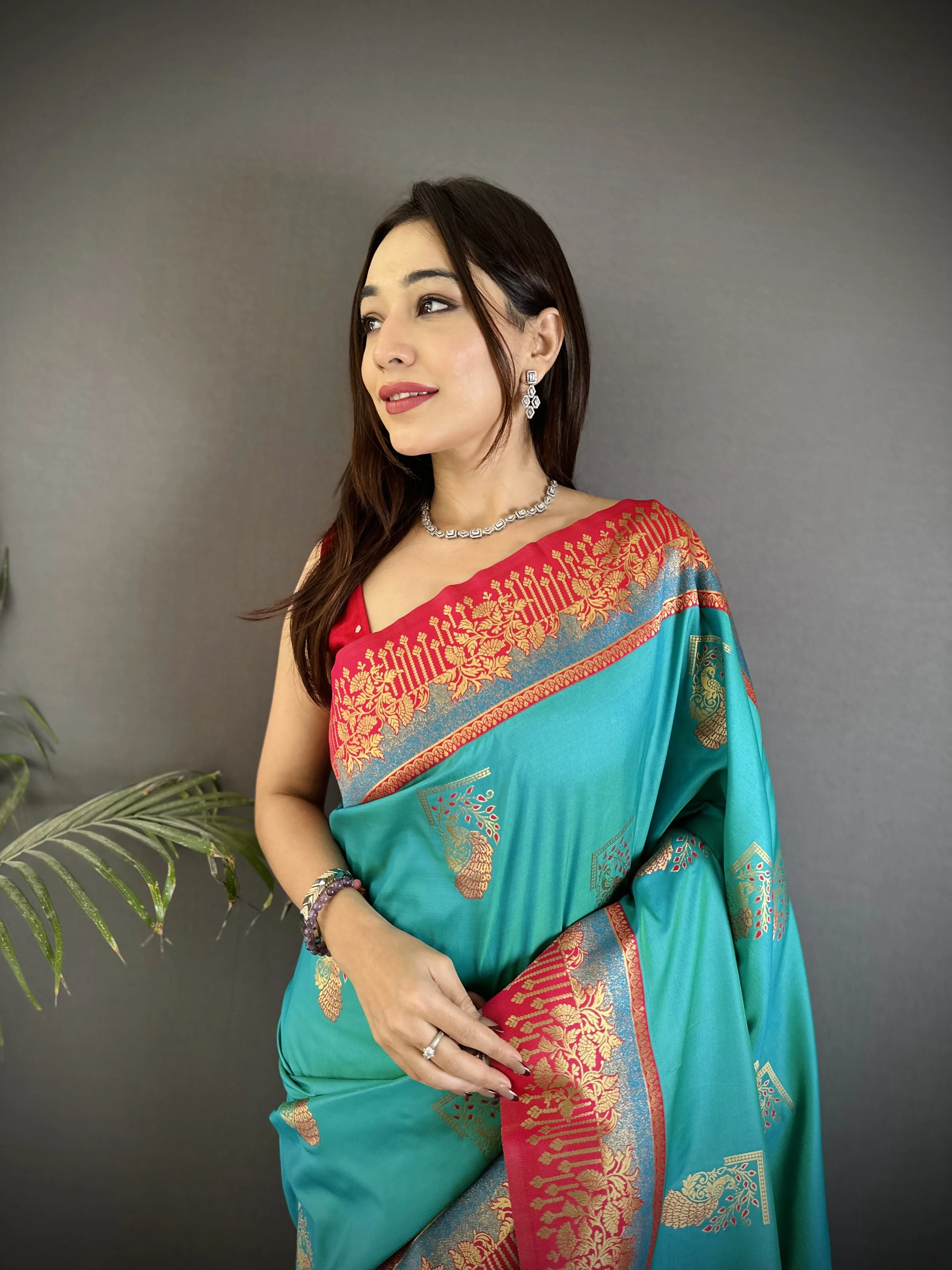 Sonakshi Women'S Teal Pure Soft Banarasi Silk With Contrast Weaving Border And Pallu Traditional Saree With Blouse