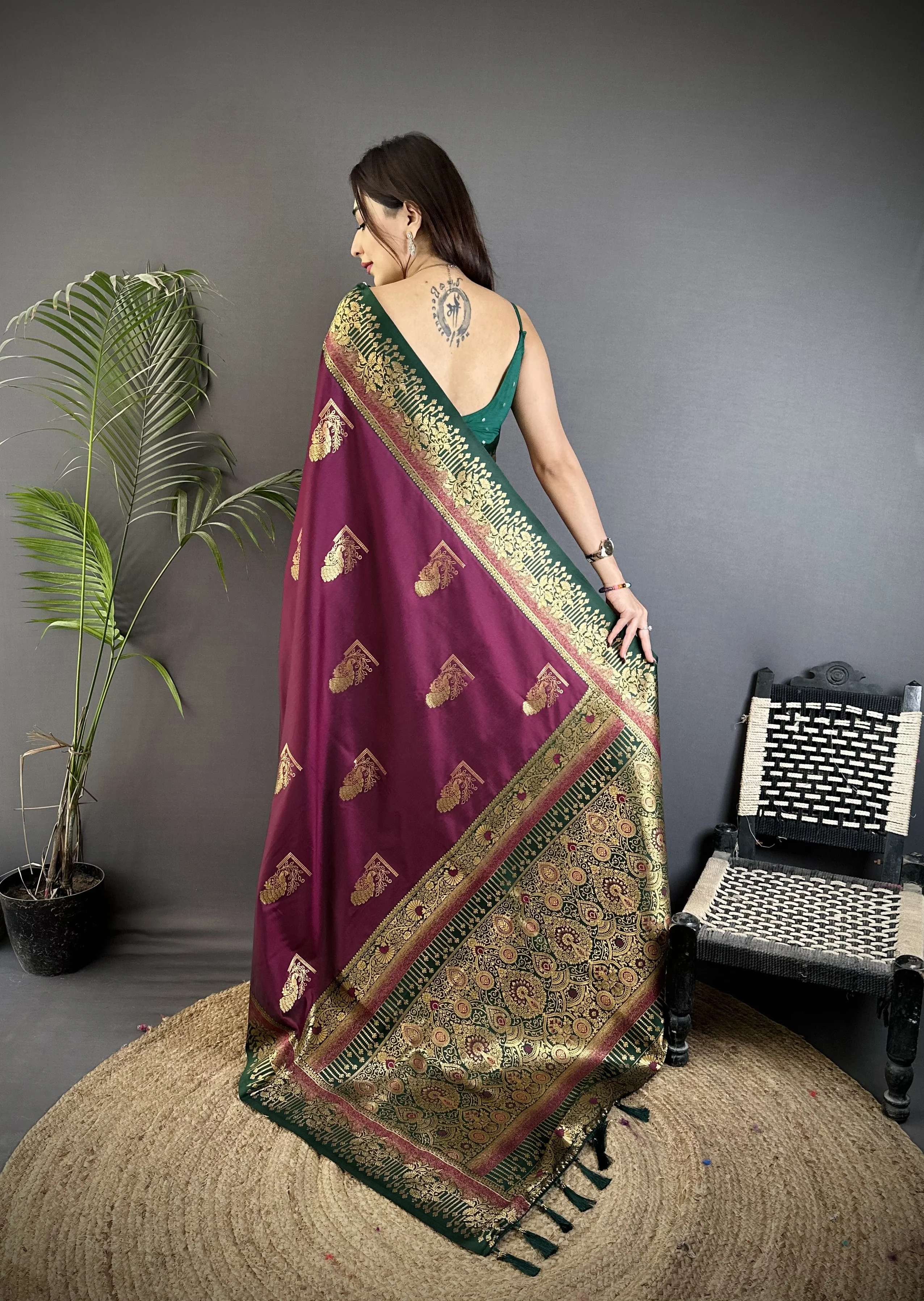 Sonakshi Women'S Wine Pure Soft Banarasi Silk With Contrast Weaving Border And Pallu Traditional Saree With Blouse